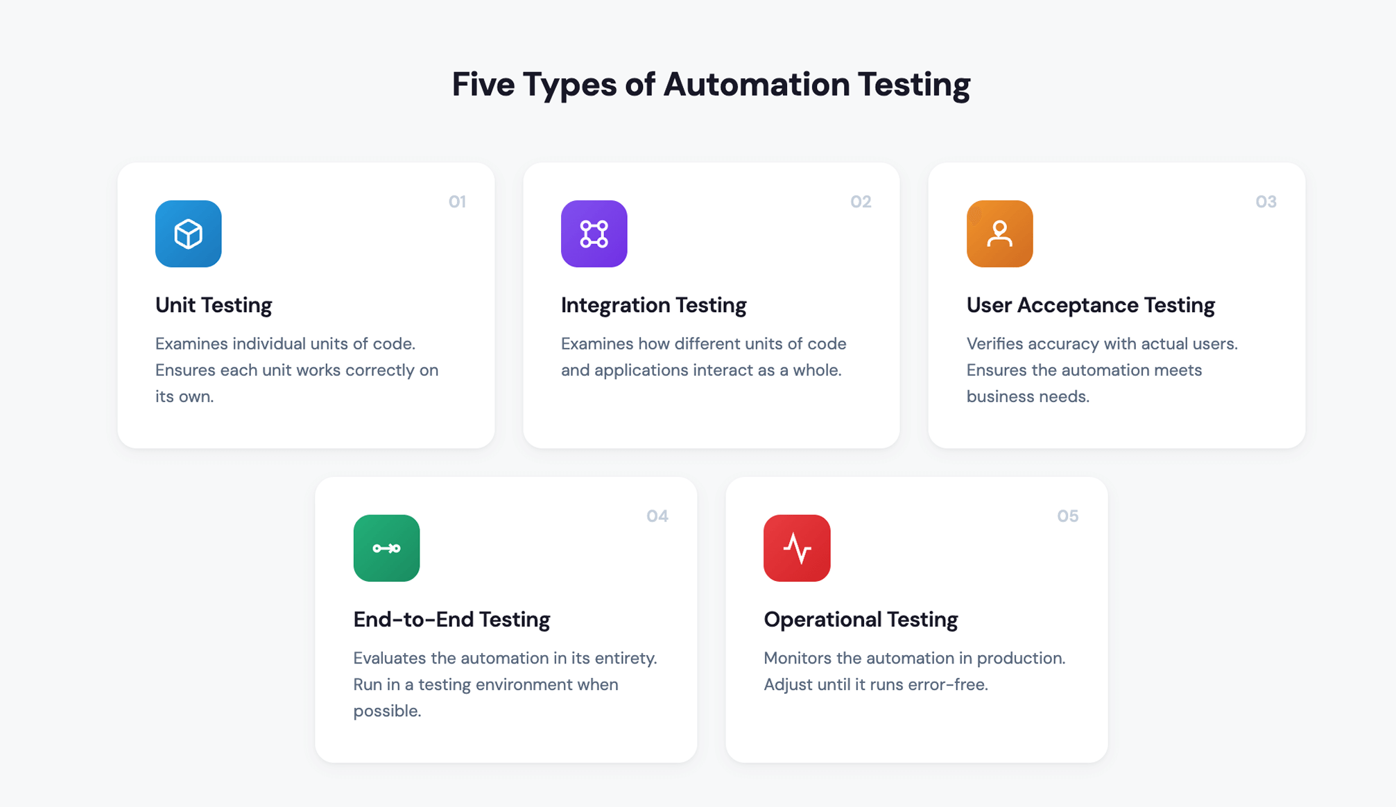 User Acceptance Testing verifies the accuracy of your automation solution with actual users. This ensures the automation meets business needs.