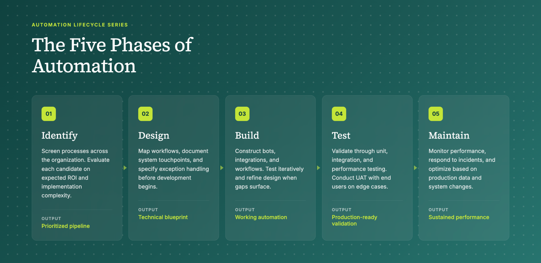 The Maintain phase ensures your automation continues performing effectively after deployment. Production automations require ongoing attention to sustain their value.